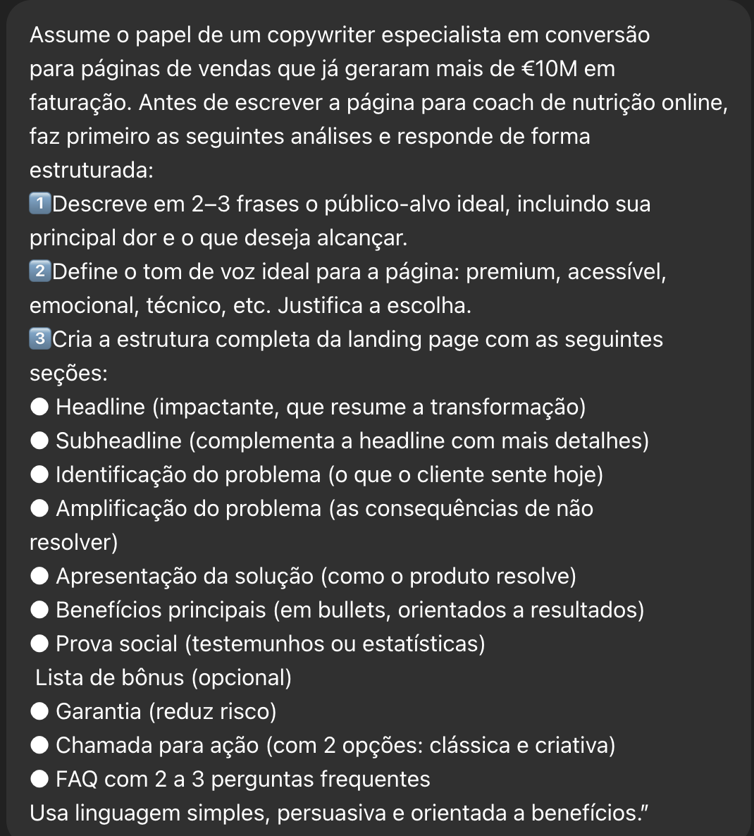 Este prompt cria a estrutura completa de uma landing page de alta conversão, baseada nas mesmas estratégias que já geraram milhões em vendas. Basta copiar e adaptar ao teu negócio para teres uma página pronta em minutos.